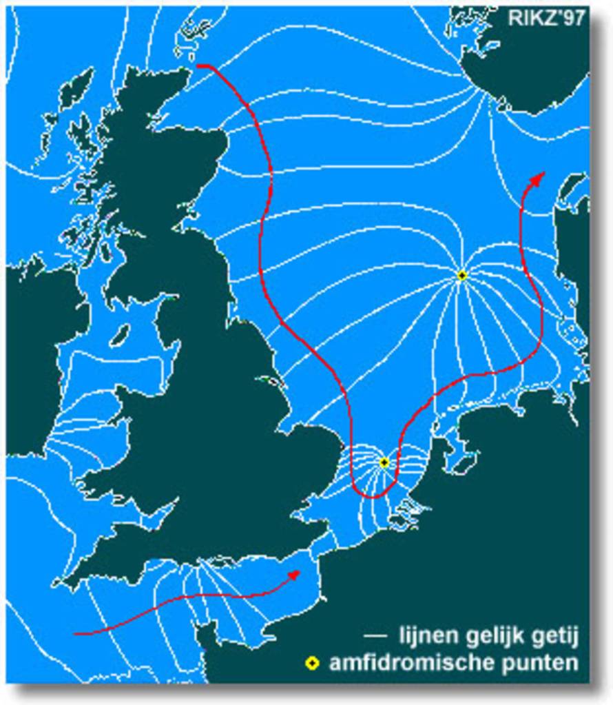 Elke plek waar er water is op aarde heeft bijgevolg z’n eigen unieke respons op de getijdenveroorzakende krachten. De getijden gedragen zich als lange ondiepwatergolven die rond oceanen en zeeën lopen en weerkaatsen, en elke zee heeft haar eigen eigenfrequentie, resonantie en vertraging, om nog niet te spreken van de Corioliskrachten die zorgen voor draaibewegingen in afgesloten stukken zee. Daarom vinden we overal ter wereld andere getijden. De continentale begrenzing van zeeën zorgt voor een opstuwen van de getijdegolf, vergelijkbaar met vloeistof die tegen de rand van een kopje upgestuwd wordt waneer we koffie morsen. Mocht de hele wereld één zee zijn, dan zou de getijslag (verschil tussen hoog-en laagwater) met moeite één meter bedragen. Wanneer de atlantische getijgolf zich echter moet wurmen rond het Verenigd Konkinkrijk en Ierland dan zien we dat dit zorgt voor veel grotere opstuwing op bepaalde kusten. Maar evengoed kunnen alle effecten zich tegen elkaar opheffen en moeten we vaststellen dat er plekken bestaan in de Noordzee waar er helemaal geen getijd is: de amfidromische punten. Met deze mooie potentiële kwisvraag rond ik deze queeste af.