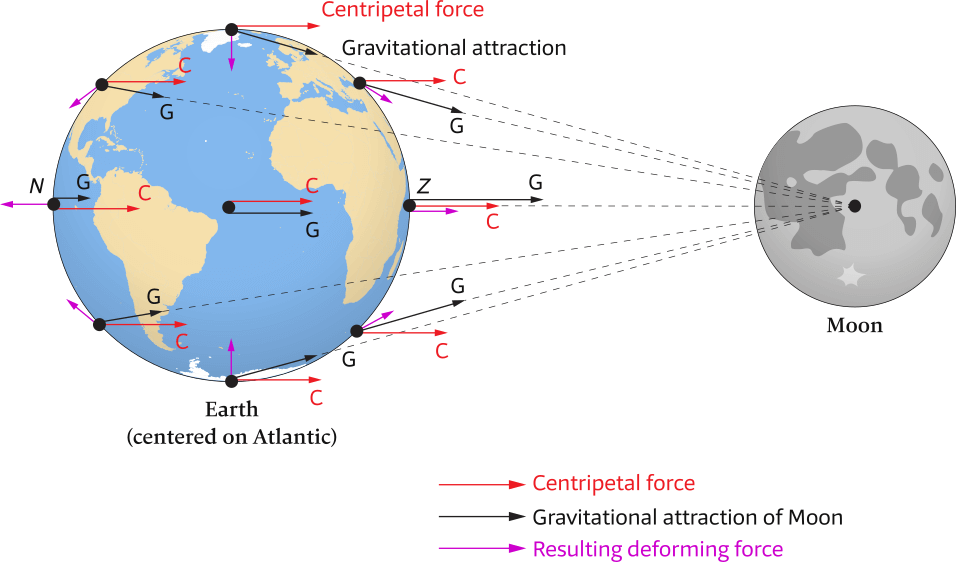 Met deze ingrediënten kunnen we het recept opstellen voor de werking van de getijden. Stel dat je een druppel water bent in het midden van de oceaan. Enerzijds versnel je samen met het middelpunt van de aarde, want samen met de rest van de aarde draai je rond het barycentrum. Anderzijds geldt de gravitatieweg van Newton op deze druppel, en bovendien stellen we vast dat de afstand tot de maan niet constant blijft. Wanneer de maan in het zenith (dichtste afstand tot de maan) staat ben je als druppel immers een aarddiameter dichter bij de maan dan wanneer je in het nadir staat (verst verwijderd van de maan). Enkel voor het zwaartpunt van de aarde zijn deze verschillende versnellingen identiek qua grootte en richting. Voor alle andere punten is er een licht verschil, en het is precies dat verschil dat de getijden veroorzaakt. In onderstaande figuur zie je hoe de paarse vectoren het verschil zijn van de versnelling (of kracht per massa) afkomstig van de gravitatie en de versnelling (of kracht per massa, ook wel centripetale kracht) afkomstig van de baan die de aarde beschrijft rond het barycentrum.